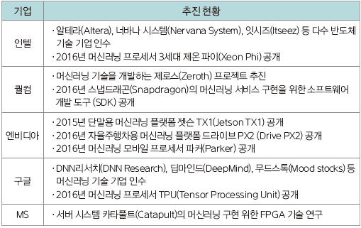 또한 엔비디아도 강점인 그래픽 반도체 기술을 기반으로 컴퓨팅 플랫폼 젯슨 TX1과 드라이브 PX2, 모바일 프로세서 파커 등 머신러닝 반도체를 출시하면서 시장 선점에 주력하고 있다. 머신러닝 기술 개발 프로젝트 제로스(Zeroth)를 추진하는 퀄컴은 스냅드래곤 프로세서의 머신러닝 소프트웨어 개발 도구(SDK)를 공개했으며, 구글도 자체 개발한 프로세서 TPU가 머신러닝 시대를 이끌게 될 것이라고 주장한다.