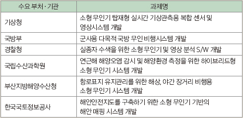 수요 부처는 드론 활용 수요를 제시한 국방부, 기상청, 경찰청, 국립수산과학원, 부산지방해양수산청, 한국국토정보공사 등 6개 부처 기관으로 요구도 조율, 중간 모니터링, 성능 검증 등 기술개발 절차 전반에 참여하며, 개발 성공 후 해당 무인기의 공공조달을 담당하게 된다.