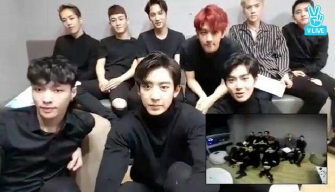 ▲ 브이 라이브(V LIVE)의 듀얼라이브기능을 사용해 방송중인 엑소(EX0) [사진=네이버]