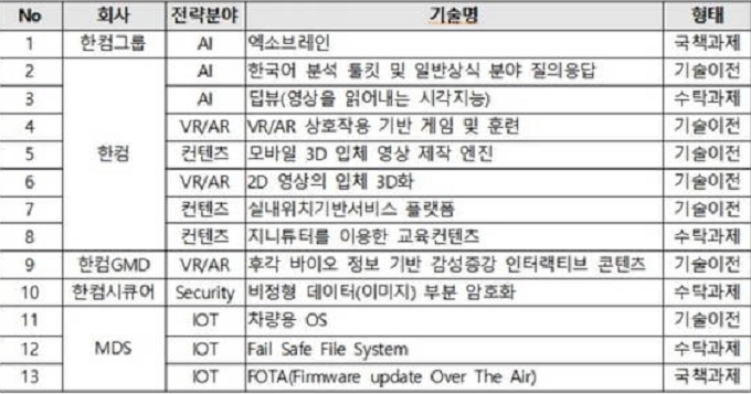 양 기관은 상호 논의와 스터디를 통해 미래 핵심기술로 손꼽히고 있는 인공지능(AI), AR(증강현실)/VR(가상현실), 임베디드/사물인터넷(IoT), 교육/콘텐츠 분야 등 5대 전략분야를 선정하고, 한컴/MDS테크놀로지/한컴시큐어/한컴지엠디 등 그룹사별로 총 13개 사업과제를 진행하기로 협의했다.