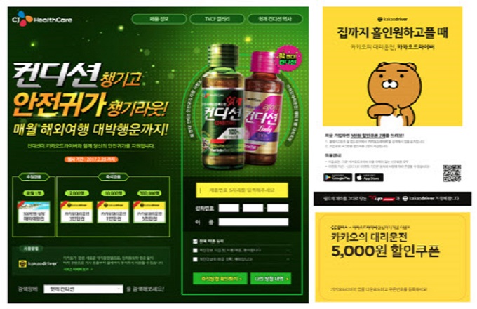 카카오드라이버는 23일부터 CJ의 숙취해소음료 ‘컨디션’과 넥택 경품 이벤트를 진행하고 있다. 내년 2월 말까지 편의점에서 판매하는 CJ컨디션 병목에 넥택을 걸고 스크래치 방식으로 해외여행 상품권, 카카오드라이버 이용 쿠폰 등 경품 당첨 여부를 확인하는 방식이다. 스크래치 후 당첨 확인은 CJ컨디션 온라인 이벤트 페이지에서 가능하다.