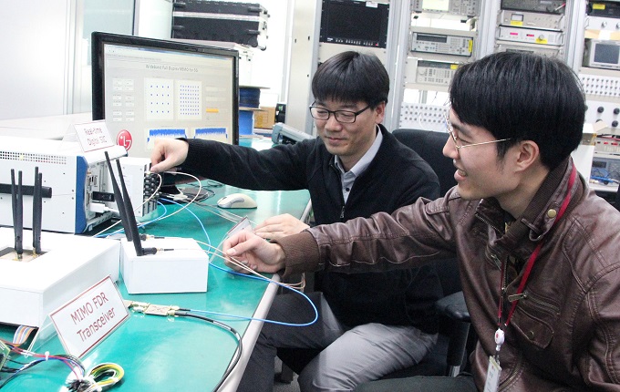 ▲ 지난달 29일 LG전자 서초 R&D 캠퍼스에서 LG전자 연구원과 연세대학교 연구원이 80MHz 대역폭의 광대역 다중안테나(MIMO, Multiple Input Multiple Output) 기반 FDR 통신기술을 시연하고 있다.