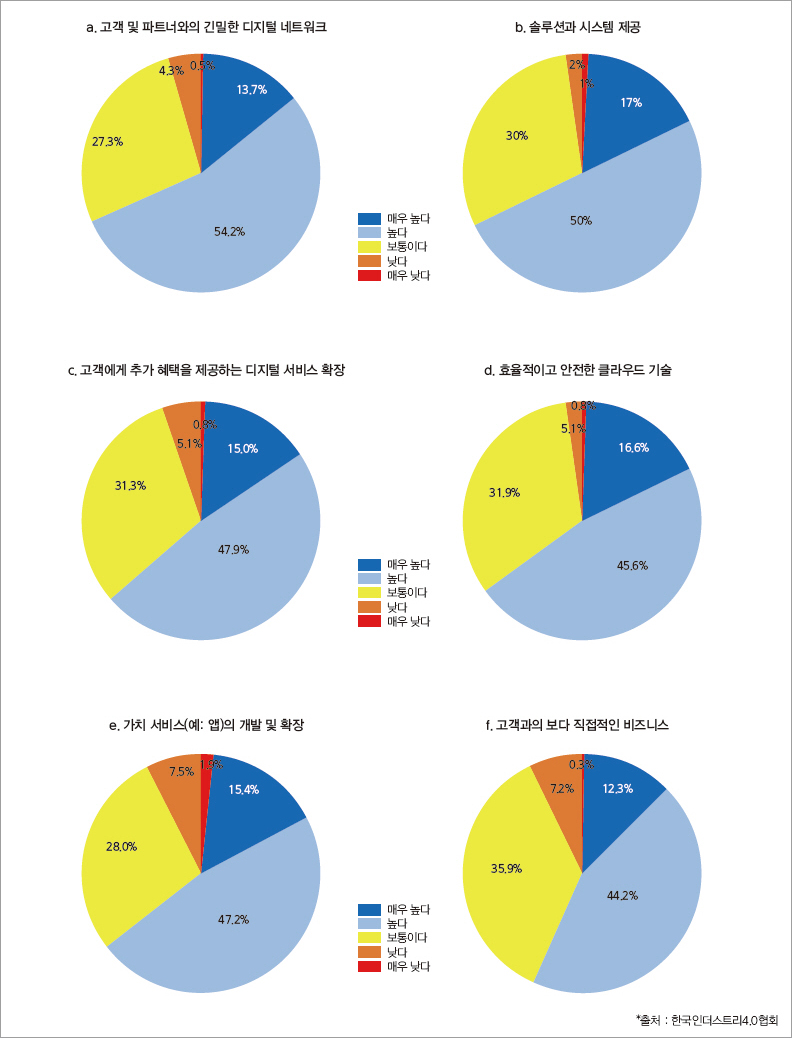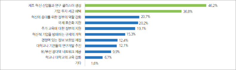 이에 대해 한국인더스트리4.0협회 임채성 회장은 “ROI와 인력 문제는 단위 기업 차원에서는 해결할 수 없고 기업과 정부가 함께 고민하며 같이 풀어가야 한다”고 말했다. 성공적인 제조 혁신을 위한 방안을 무엇인지, 우리나라 제조업의 4차 산업혁명 대응 실태 관한 설문조사 결과를 그래프로 정리했다.