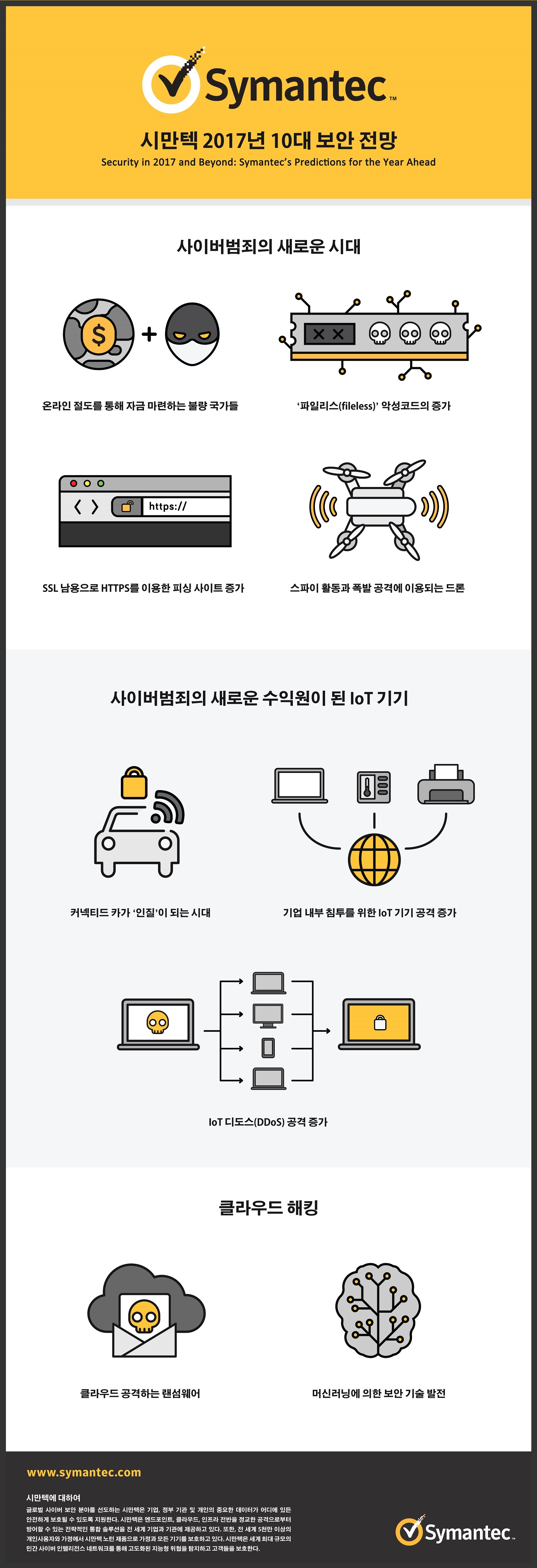 글로벌 사이버 보안 기업 시만텍이 2017년 10대 보안 전망(Security in 2017 and Beyond: Symantec’s Predictions for the Year Ahead)’을 발표했다. 이에 따르면 파일리스(fileless) 악성코드가 증가하고 신종 사이버 범죄로 ‘드론재킹’, ‘커넥티드 카 해킹’이 등장할 것으로 예상된다. 여기에 IoT 기기 및 클라우드 환경을 겨냥한 사이버 공격이 본격화될 우려가 있어 보안 방식에 변화가 필요하다.