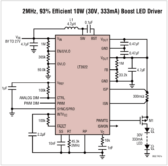 리니어 테크놀로지의 LT3922(그림 2)는 40V, 2A 파워 스위치와 PWM 제너레이터가 내장된 모놀리식 동기식 스텝업 DC/DC 컨버터다. 고정 주파수 피크 전류 모드 제어 방식으로 동작되며 최대 34V까지의 LED 스트링에 대해 ±2% 이내로 LED 전류를 정확하게 제어한다. 내장된 PWM 제너레이터는 최대 128:1의 디밍 비율을 제공한다. 5,000:1의 디밍 비율이 요구되는 애플리케이션에는 LT3922와 외장 PWM 제너레이터를 사용하면 된다. LT3922의 입력 전압 범위는 2.8V ~ 36V로서 자동차, 산업용, 건축 조명 같은 매우 다양한 애플리케이션에 적합하다. 리니어 테크놀로지 고유의 사일런트 스위처(Silent Switcher) 토폴로지와 대역 확산 주파수 변조 기술이 결합되어 EMI 문제를 최소화한다. LT3922는 자동차용 전원 입력에서 최대 34V, 350mA의 백색 LED를 10W 이상 구동 가능하다. LT3922는 하이사이드 전류 감지를 통합하고 있어서 부스트 모드와 벅 모드 또는 벅-부스트 토폴로지에 사용할 수 있다.