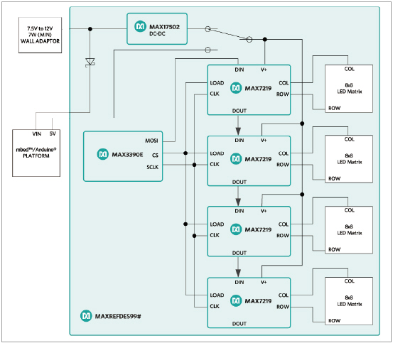 최근 Maxim은 4개의 MAX7219 LED 드라이버를 통합해 256개의 LED가 있는 16x16 디스플레이를 생성하는 기준 설계 MAXREFDES99 #(그림 3)를 출시했다. MAXREFDES99 #은 최소 7W의 전력과 7.5V dc ~ 12V dc 범위의 출력 전압을 제공하는 벽 사마에서 전원을 공급받을 수 있다. 레퍼런스 디자인은 Arduino 및 ARM mbed 플랫폼 모두에서 작동한다.