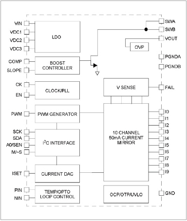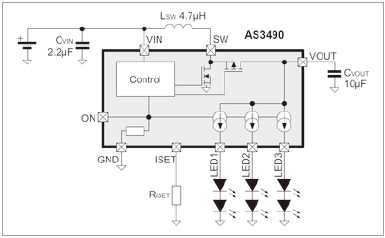 DC-DC 컨버터의 출력은 최대 10개의 LED에 연결된 5개의 전류 소스에 사용된다. AS3496에는 단락 보호(SLP), 개방형 LED 보호(OLP) 및 과전압 보호(OVP)와 같은 기본 보호 메커니즘이 내장돼 있다. 이 디스플레이 백라이트 드라이버는 휴대폰, 디지털 카메라, PND 및 PMP 용으로 특별히 설계됐다.