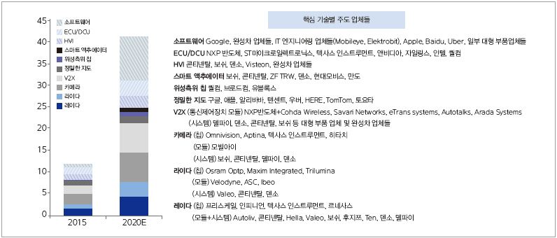 신차 기준이 아닌 자율주행 기술 발전에 따른 기회 시장 측면에서 산업의 성장성을 살펴보면, 기회 시장 규모가 2015년 120억 달러 수준에서 2020년 410억 달러까지 연평균 28%의 속도로 성장할 것으로 추정됐다. 각 핵심 기술별 기회 시장 규모의 변화 및 주도 업체들 목록은 그림 2에서 본 바와 같다.