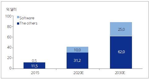 각 분야별 주도하는 업체를 보면, 소프트웨어 분야에서 단연 두각을 나타내고 있는 Google, 글로벌 V2X 통신제어장치 모듈 M/S 60%를 차지하고 있는 NXP 반도체, 카메라 센서 모듈의 소프트웨어 알고리즘 글로벌 M/S 80%이상을 차지하고 있는 Mobileye 등이 대표적으로 이에 해당한다. 한편, Lux Research는 이 기회 시장 규모가 2030년에는 870억 달러에 이를 것으로 전망하고 있다. 특히, 소프트웨어의 기회 시장 규모는 2030년에 250억 달러까지 성장할 것으로 전망하고 있다(그림 3 참조). Google, Apple, Baidu 등의 ICT 업체가 이 기회 시장에 집중하는 이유이며, 완성차 업체들 역시 독자적인 소프트웨어 개발에 박차를 가하는 이유이기도 하다.