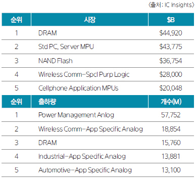 특정 애플리케이션을 위한 차량용 아날로그 부품 및 32비트 마이크로 컨트롤러는 각각 성장률 11%와 12%로 늘어나 메모리를 상회할 것으로 예측됐다. 또한 광전자 및 센서, 디스크리트 등의 다양한 분야도 반도체 시장 전체를 크게 견인해 나갈 것으로 전망된다.