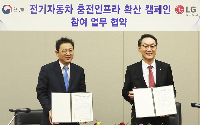 환경부와 LG전자가 13일 LG전자 VC사업본부 인천캠퍼스에서 ‘전기차 충전인프라 확산 캠페인 참여 업무협약’을 체결하면서 올해 안에 LG전자 모든 사업장에 전기차 충전기가 설치된다.