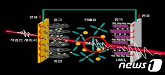 이차전지 내 음극과 양극 사잉에서 리튬이온을 통해 전류가 흐를 수 있는 통로 역할을 하는 전해질에 이차원 적외선 분 광기의 펨토초 레이저를 가하는 모습.© News1