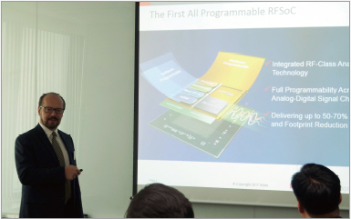 우선 RFSoC 디바이스에 관한 발표를 살펴보고자 한다. 지난 2월 15일 여의도에 위치한 자일링스 한국지사 사무실에서 기술 발표가 이루어졌다. 자일링스의 FPGA 플랫폼 마케팅 부사장인 팀 엘야백(Tim Erjavec)과 통신 사업 부분 이사인 하핀더 마따루(Harpinder S Matharu)가 한국을 방문하여 이 날 발표에 참여했다.