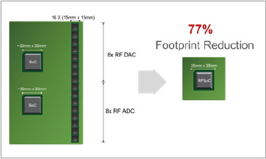 그림 2에서는 폼팩터 크기 감소에 대해 살펴보 수 있다. 전력 소비와 마찬가지로 전형적인 구성에서는 RF ADC나 DAC가 채널 당 보드에서 최대 15x15mm를 차지할 수 있는데 그림 2를 보면 더 큰 라디오 구조의 경우, 급격히 폼팩터를 줄일수 있어 완전히 배치 가능한 멀티 채널 시스템을 75% 이상 감소 가능하다.