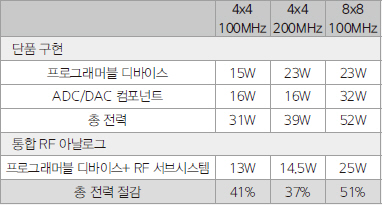 자일링스가 발표 내내 거듭 강조했던 전력 및 폼팩터 크기 감소에 대해 자세히 살펴보자. 표 1을 보면 전형적인 안테나 구성은 단품 ADC와 DAC가 소비하는 전력이 매우 크다. 반면 ADC와 DAC를 통합한 RFSoC는 기본 구성에 비해 40%나 전력 감소가 가능하다.