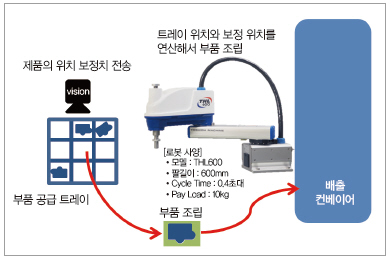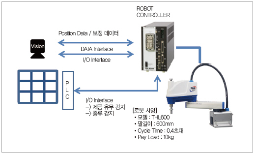 때에 따라서는 각각의 위치에서 부품 공급 측의 부품이 일정 위치로 공급되지 못한 때도 있다. 이 경우 원하는 위치의 제품을 비전시스템으로 검사하고 정확한 X, Y, 각도 정보를 로봇으로 보내서 로봇은 이를 보정한 위치로 이동시킴으로써 부품의 정확한 조립이 가능해진다.