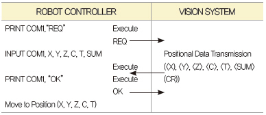 여기서 비전 시스템은 2가지 방법으로 데이터를 보낼 수 있다. 로봇의 작업 반경을 비전에서 고려해서 절댓값으로 보내는 것과 이미 지정된 위치에 대한 변화량의 오프셋 치만을 증분값으로 연산해서 보내는 방법이 있다. 이것은 작업해야 하는 환경 또는 제품에 따라서 달라지고 비전 데이터에 따라서 로봇의 프로그램 방법이 달라져야 한다. 이 경우 데이터 전송에 사용되는 통신 방법은 RS-232C 또는 Ethernet을 사용하게 되는데, 로봇 제어기의 프로토콜을 맞추어 사용해야 한다.