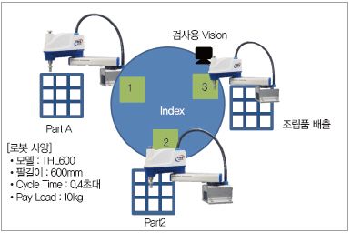 인덱스와 로봇이 조합되는 경우는 종류가 다른 부품을 조립하는 공정에서 하나의 지그를 사용하고 각각의 부품을 로봇으로 공급과 조립을 동시에 할 때 사용된다. 제품의 마지막 공정에서는 검사가 필요한데, 검사 방법은 비전으로 하거나 제품 특성에 따라 다양한 형태로 수행한다.