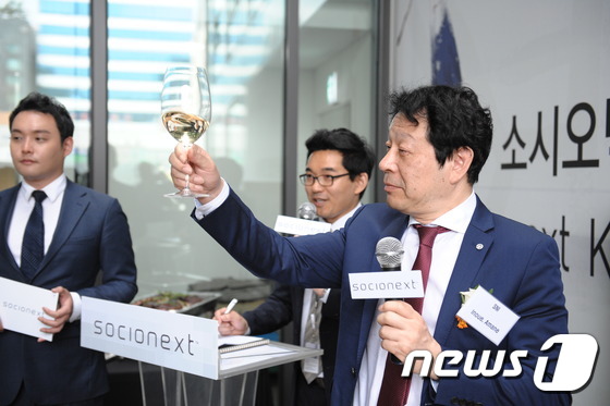 이노우에 아마네 소시오넥스트 대표(오른쪽)가 23일 경기도 분당에 위치한 소시오넥스트코리아 '솔루션랩' 개관식에서 건배 제의를 하고 있다. © News1