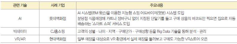 ▲ 표1. 국내 주요 유통기업의 4차 산업혁명 기술 적용 사례