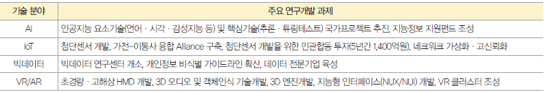 ▲ 표 2. 4차 산업혁명 기술분야별 연구개발 현황(‘17년 산업부, 미래부 업무보고)