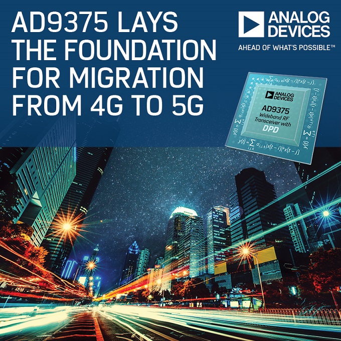 AD9375 트랜시버는 300MHz~6GHz 주파수 범위에서 조정 가능하고, 6Gbps JESD204B 인터페이스에서의 전력 소비도 5W가 채 되지 않는다. AD9371와 마찬가지로 AD9375는 100MHz Bandwidth의 수신2 Path, 250MHz Bandsidth의 송신 2 Path, 2Port 피드백 Path, 3 Port 스니퍼 Path로 구성된다. 트랜시버의 통합 DPD 솔루션은 최대 40MHz의 순간 신호 대역폭에서 3G와 4G 파형의 비선형 성분을 전치 왜곡 보상한다.