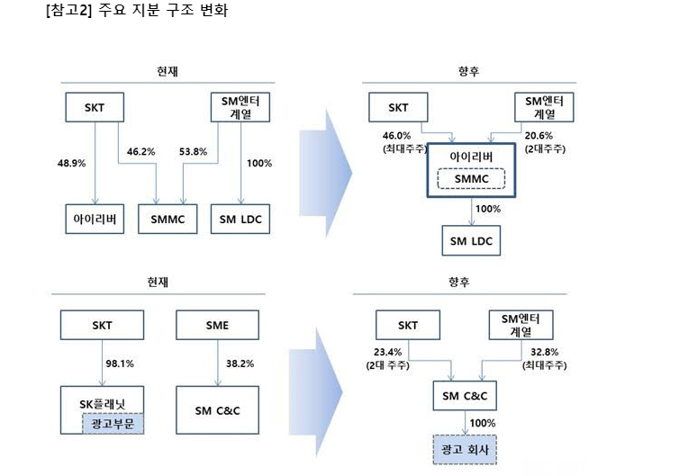 이번 협약으로SK텔레콤은 SM C&C의 2대 주주가 되며, SM엔터테인먼트는 아이리버의 2대 주주가 된다. 또 아이리버는 SM 계열회사인 SM모바일커뮤니케이션즈(이하 SM MC)와 SM Life Design Co.(이하 SM LDC)를 흡수해 콘텐츠 기반 신규 사업을 추진하고, SM C&C는 SK플래닛의 광고 사업을 인수한다.