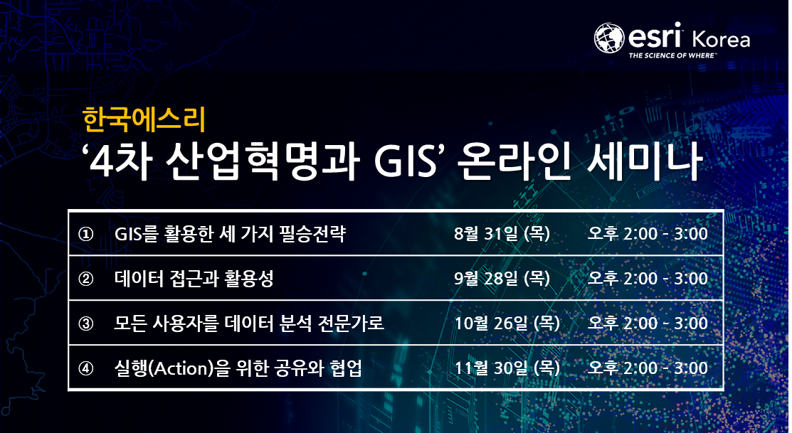 공간정보시스템(Geographic Information System, 이하 GIS) 전문 기업 한국에스리(사장 리차드 윤)는 데이터의 활용과 GIS 기술을 설명하는 무료 온라인 세미나 시리즈를 오는 8월 31일부터 매월 마지막주 목요일 총 4회에 걸쳐 진행한다.