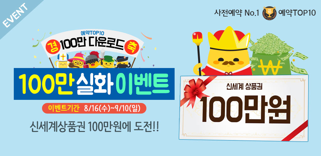애드웨이즈는 다음달 10일까지 예약TOP10의 100만 다운로드 돌파를 기념해 100만 실화 이벤트를 실시한다. 이벤트 미션을 달성한 유저 가운데 추첨을 통해100만원의 신세계 상품권과 모바일 문화상품권 1만원권을 100명에게 제공한다.
