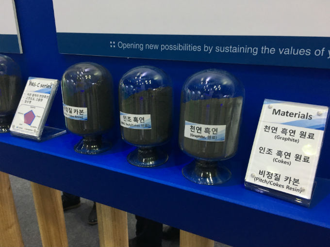 포스코켐텍은 2차전지 배터리 음극재를 만드는 기업으로 현재 LG화학, 삼성SDI 등에 주로 공급하고 있다. 이번 전시회에서 소개하는 음극재는 천연흑연계 음극재, 인조흑연계 음극재, 탄소계 음극재로 구분돼 있는데, 제공 공정에서는 표면코팅 및 열처리 기술이 이 기업의 특징이라 할 수 있다. 그리고 음극재에 사용되는 원료는 포스코의 코크스 과정에서 발생하는 COG(Coke Oven Gas)를 활용했다는 점이 국내에서 유일하게 가질 수 있는 장점이다.