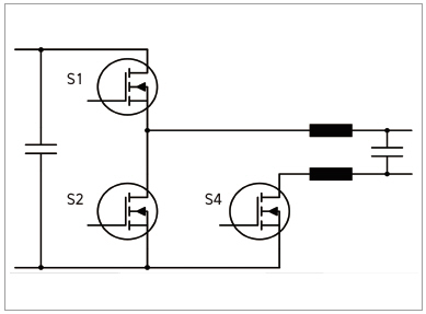 그림 1에서와 같은 하프 브리지 셀을 가지고 모든 FET의 스위칭 동작을 설명할 수 있다. S1과 S2는 벅 구성으로 스위칭하며, S4는 계속적으로 턴온해서 리턴 전류 경로를 제공한다. S1은 능동 스위치이다. S1을 턴온하면 인덕터 전류가 상승한다. S2는 정류기 스위치로서, S1이 턴오프되고 인덕터 전류가 떨어질 때 이의 바디 다이오드가 인덕터 전류를 전도한다. 이 동작은 모터의 동작 사이클의 1/3에 일어난다. 그런 다음 그 다음 하프 브리지로 동일한 동작이 일어난다. MOSFET의 스위치 모드 동작은 높은 dv/dt와 di/dt를 발생시킨다.