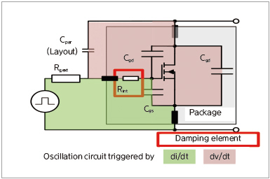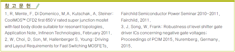 또한 턴오프 시에 높은 dv/dt는 드레인-게이트 커패시턴스를 통해서 게이트로 결합함으로써 발진을 일으킬 수 있다. 이러한 문제들은 그림 2에서 보는 것과 같이 FET 파라미터, 패키지, 레이아웃 기생 성분들과 관련이 있다. 그러므로 게이트 드라이버 설계 시에 이러한 요인들을 잘 고려해야 한다.