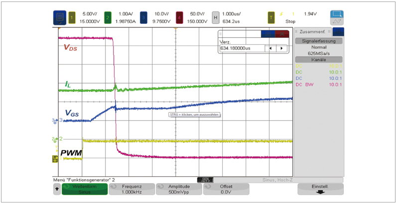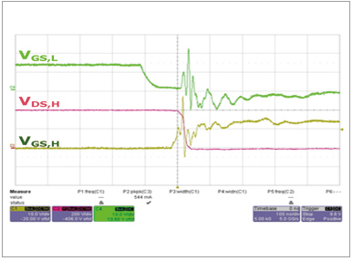 게이트 저항을 게이트 단자에 가깝게 하고 부유 인덕턴스를 낮춤으로써 CoolMOS 트랜지스터로 향상된 성능과 우수한 스위칭 동작을 달성할 수 있다. 그림 6은 이 구동 회로 디자인의 턴온 파형을 보여준다. 게이트 신호가 발진을 일으키지 않고 깨끗하며 드레인-소스 전압이 밀러 플래토 구간에서 천천히 0V로 떨어진다는 것이다. 다른 두 스위칭 브리지도 레이아웃과 구동 회로를 똑같이 한다면 동일한 동작을 예상할 수 있다.
