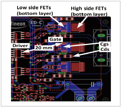 또한 이렇게 엇갈리게 함으로써 하측 트랜지스터의 드레인 단자가 소스 단자의 바로 밑에 오게 되었다. 그럼으로써 적정한 수의 비아를 사용해서 상측 소스 단자로 가깝게 연결할 수 있다. 그럼으로써 루프 인덕턴스를 최소화한다. 하측 트랜지스터를 상단면에 적절하게 배치하면 양면 어셈블리를 피할 수 있다. 하지만 이렇게 하면 더 많은 면적을 차지할 것이다. 게이트 구동 루프로 잡음과 공진을 줄이기 위해서는 일반적으로 다음과 같은 레이아웃 가이드라인이 권장된다.