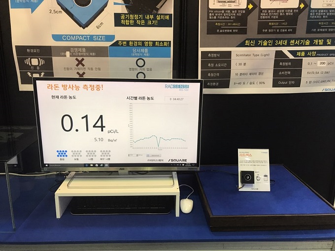 이번 전시회에 선보인 아이스퀘어의 가정용 라돈 측정기는 전원을 켠 후 1시간 뒤 라돈 수치가 확인 가능하며 1시간 이후부터는 10분마다 라돈 수치를 갱신할뿐만 아니라 현재 수치/최고추기/최근 24시간 평균치를 함께 표시해주어 쉽게 비교가 가능할 수 있도록 한다. 인테리어 소품같은 유려한 디자인과 가볍고 작은 크기, 다양한 색상도 이 제품의 장점이다.