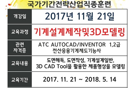 부산기장직업학교가 11월24일까지 기계설계제작 및 3D모델링 과정을 추가 모집한다.