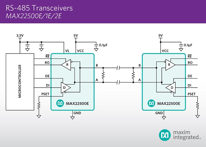 MAX22500E/MAX22501E(반이중∙half-duplex)와 MAX22502E(전이중∙full-duplex) ESD(Electrostatic Discharge) 보호 RS-485/RS-422 트랜시버는 50미터 구간에서 100Mbps(100미터는 50Mbps) 최대 속도를 지원한다.
