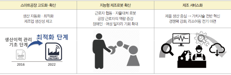 한계에 직면한 제조업의 재도약을 위해 기초 단계인 스마트공장을 ‘생산 최적화’ 단계로 고도화, 근로자와 협업 가능한 지능형 제조로봇 상용화 등을 통해 근로자의 역량을 증강시켜 장애인·여성 등의 일자리 기회를 확대하기로 했다. 또한, 제품 생산 중심에서 탈피, 제조업의 서비스화(servitization)를 촉진하는 플래그십 프로젝트를 추진하여 중기 제조업의 경쟁력을 높이고 해외 생산기지의 국내복귀(리쇼어링, Reshoring)의 전기를 마련키로 했다.