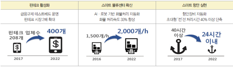 금융·물류분야에서는 지능형 금융·물류 혁신을 촉진키로 했다. 핀테크 활성화를 위해 블록체인 기술을 고도화하는 한편, (가칭)금융혁신지원 특별법 제정 등을 통해 혁신적 핀테크 서비스를 규제부담 없이 테스트할 수 있는 금융규제 테스트베드를 확대하고, 로봇 기반의 화물처리 자동화 스마트 물류센터, 항만장비 자동화 스마트 항만 도입·확산으로 지능형 물류 혁신을 선도키로 했다.