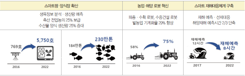 농수산업의 생산성 제고와 일손부족 문제 해소를 위해 원격제어 기반 1세대에서 정밀재배 기반 2세대 스마트팜·양식장으로 고도화하고, 파종·수확로봇 및 수중건설 로봇 현장보급을 추진키로했다.