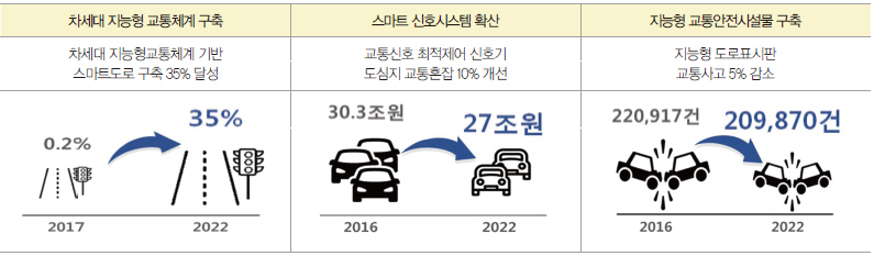 다음으로 교통분야의 경우, 빠르고 안전한 지능형 교통체계로 전면 전환된다. 주요 고속도로·안전취약 구간이 차세대 지능형 교통체계를 적용하여 전면 스마트화되고, 지능형 신호등이 설치 의무화되어 교통혼잡을 대폭 개선시킬 계획이다.