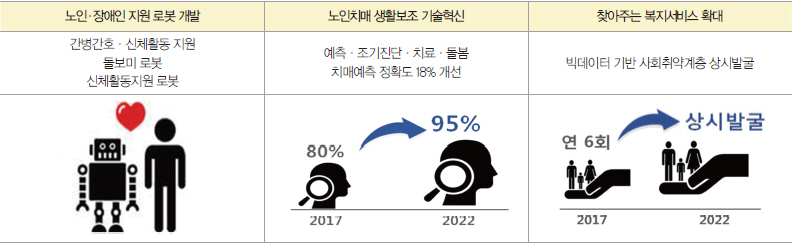 복지분야에서는 사회적 약자의 일상생활 불편 해소 및 스마트 생활복지 산업이 육성된다. 간병부담 증가에 대응하여 노인·장애인 대상 간병·간호 로봇을 개발하고, 재활병원·요양시설 등에 확산키로 했다. 그리고, 치매극복을 위해 저비용·고정밀 진단기술 개발, 낙상·실종방지 등 안전기술 확보를 추진하고, 빅데이터 기반 사회취약계층 상시발굴 등을 통해 복지사각지대를 제거하기로 했다.