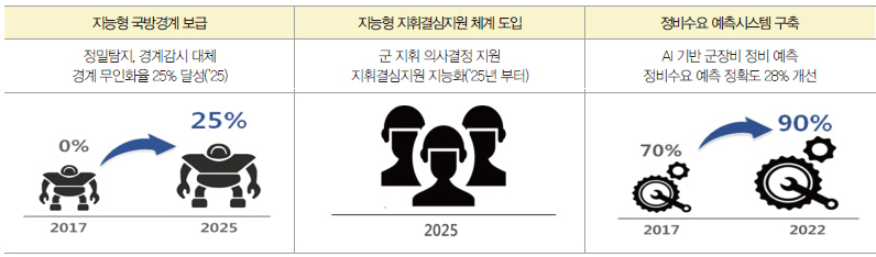 국방 전반에 지능화 기술을 적용, 지능형 경계감시시스템을 개발하여 군사중요지역 등의 경계근무 무인화를 단계적으로 확산하고, 인공지능 기반의 지능형 지휘체계 도입으로 효율적 국방 운영체계를 구축하고, 군병력 감소에 대응키로 했다.