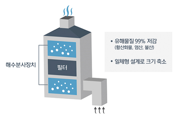 배기가스 세정설비는 선박 엔진의 배기가스를 물로 세척해 황산화물과 염산, 불산 등의 유해물질을 최대 99%까지 제거하는 친환경 장치이다.