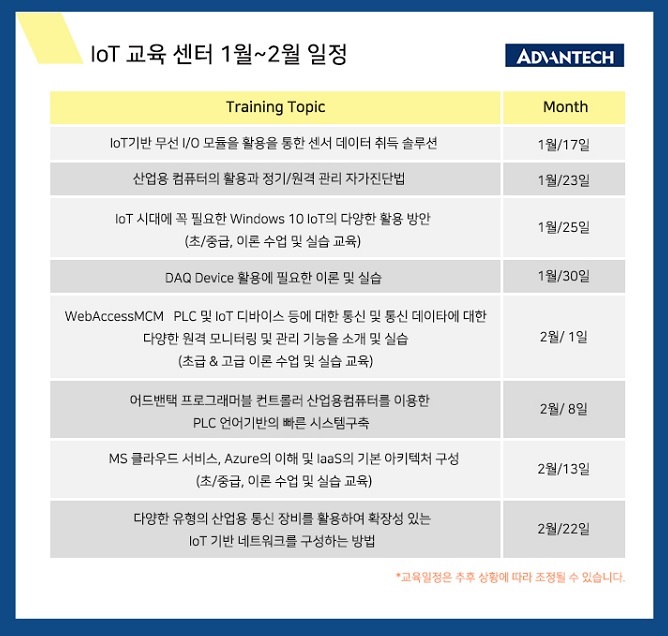 어드밴텍은 1월 17일 진행되는 IoT기반 무선 I/O 모듈 활용을 통한 센서 데이터 취득 솔루션 교육을 시작으로 지능형 엣지 게이트웨이를 이용한 데이터의 처리, 각 산업 어플리케이션에 맞는 데이터의 활용과 원격 모니터링 및 관리 기능 등을 직접 실습을 통해 습득할 수 있도록 할 예정이다.
