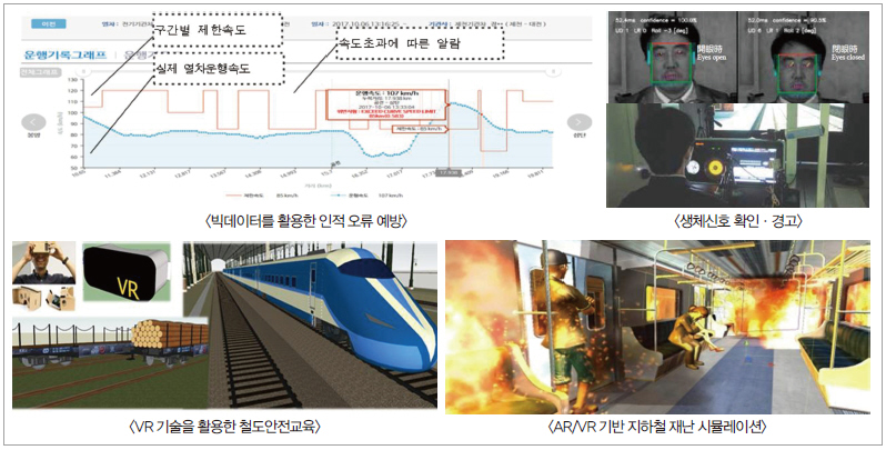 철도의 구간별 제한속도와 기관사의 열차의 실제 운행속도 관련 빅데이터를 비교·분석하여 위험구간, 기관사 위험습관 등을 찾아내어 사전에 개선하는 사업을 올해부터 시범실시하고, 운전자의 생체 신호를 인지하여 졸음·피로 등에 따른 위험을 실시간으로 확인·경고하는 기술도 단계적으로 개발해 나갈 계획이다.
