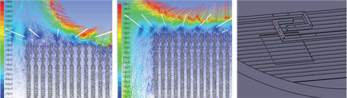 ▲ 서울시립대학교 햄니친구들팀이 수행한 가스노즐 분석 결과로 노즐 구조 재설계 전(왼쪽)과 후(가운데).
