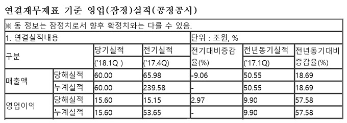 삼성전자는 2018년 1분기 잠정 실적에 따르면 연결기준 매출 60조 원, 영업이익 15조 6000억 원을 달성했다고 밝혔다.