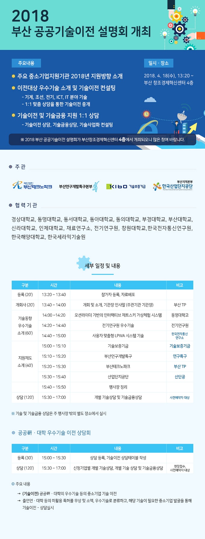 이 행사는 공공기관이 가진 기술을 중소기업에게 나눠 경쟁력을 높이는 사업이다. 부산시와 산업통상자원부가 공동 주최한다.