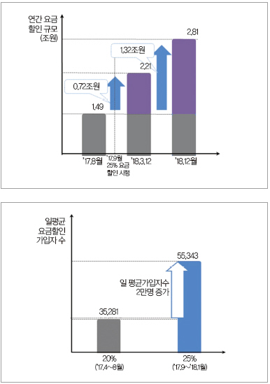 25% 시행 전 20% 요금할인 가입자들이 1년 동안 제공받는 요금할인 규모는 약 1.49조원이었으나, 현재 요금할인 가입자 기준으로는 1년 동안의 요금할인 규모가 약 2.21조원으로서 제도 시행 전에 비해 약 7,200억원이 증가하였다.